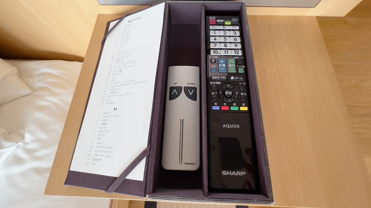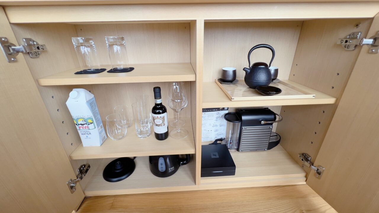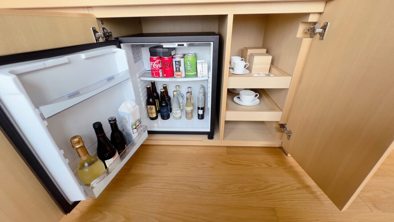 テレビはベット足元にある棚からリモコン操作でせり出してくるという設計です ベットやデスクから窓の景色を楽しめるように配慮がされています 冷蔵庫の中はアルコール類以外であれば 無料で飲むことができます もちろんターンダウンで補充されています テーブルの上には菓子類がありました もちろんこれらの菓子類もターンダウンで補充されます