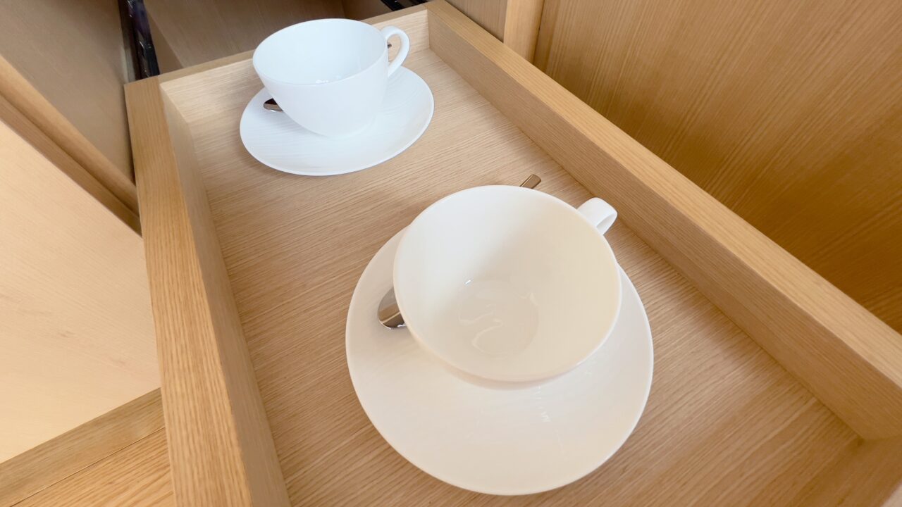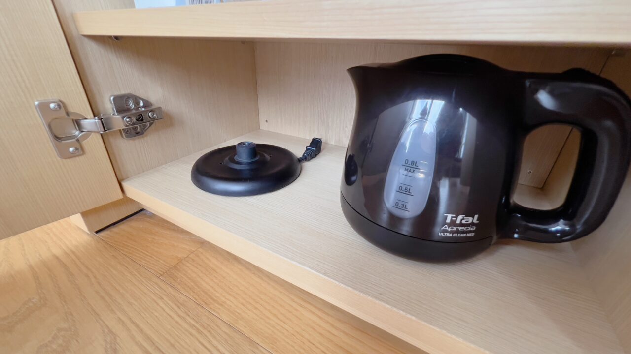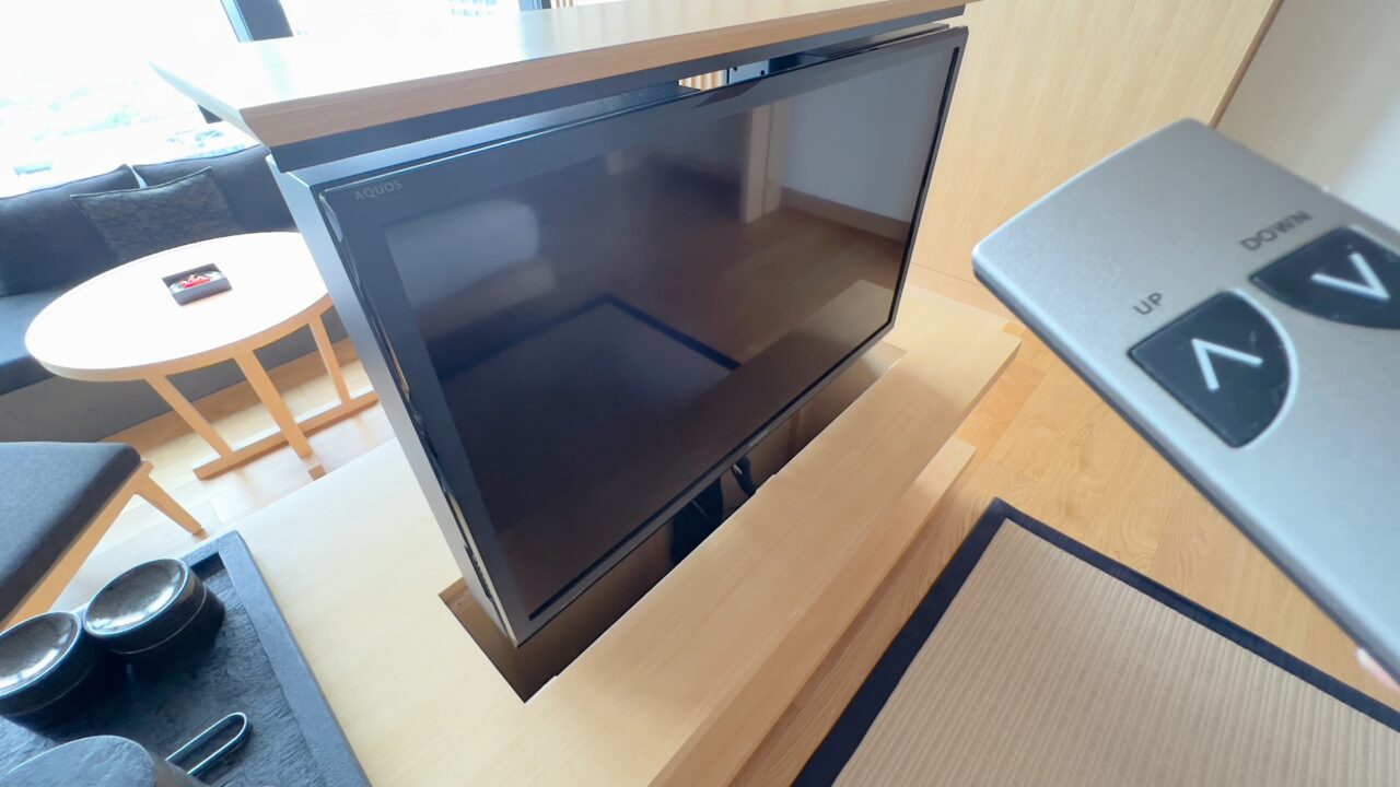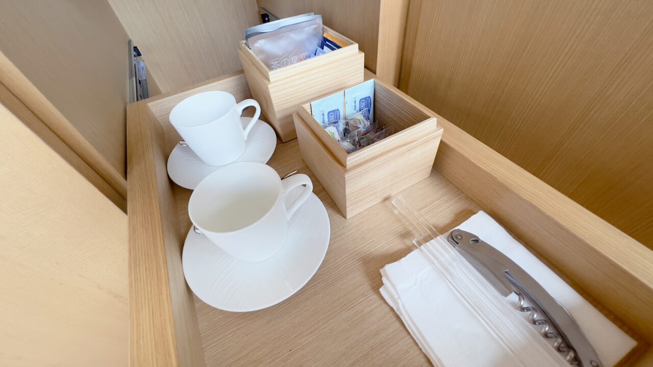 テレビはベット足元にある棚からリモコン操作でせり出してくるという設計です ベットやデスクから窓の景色を楽しめるように配慮がされています 冷蔵庫の中はアルコール類以外であれば 無料で飲むことができます もちろんターンダウンで補充されています テーブルの上には菓子類がありました もちろんこれらの菓子類もターンダウンで補充されます