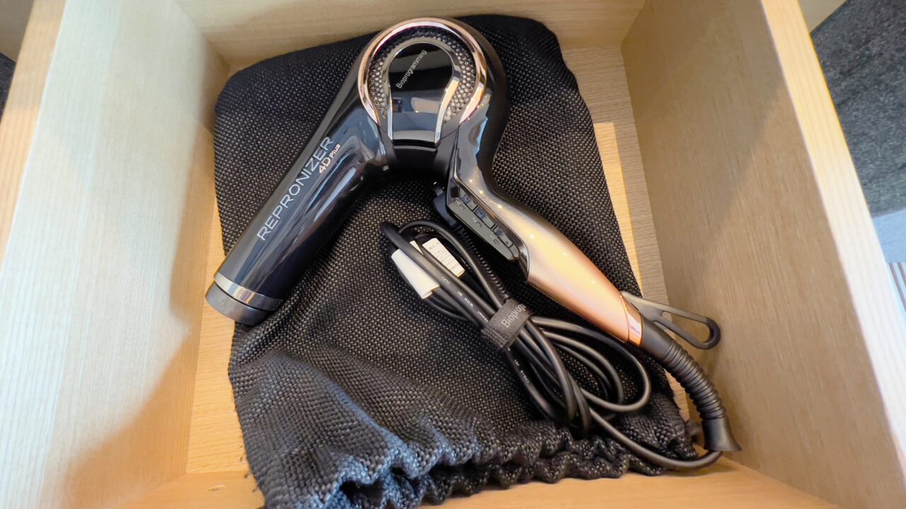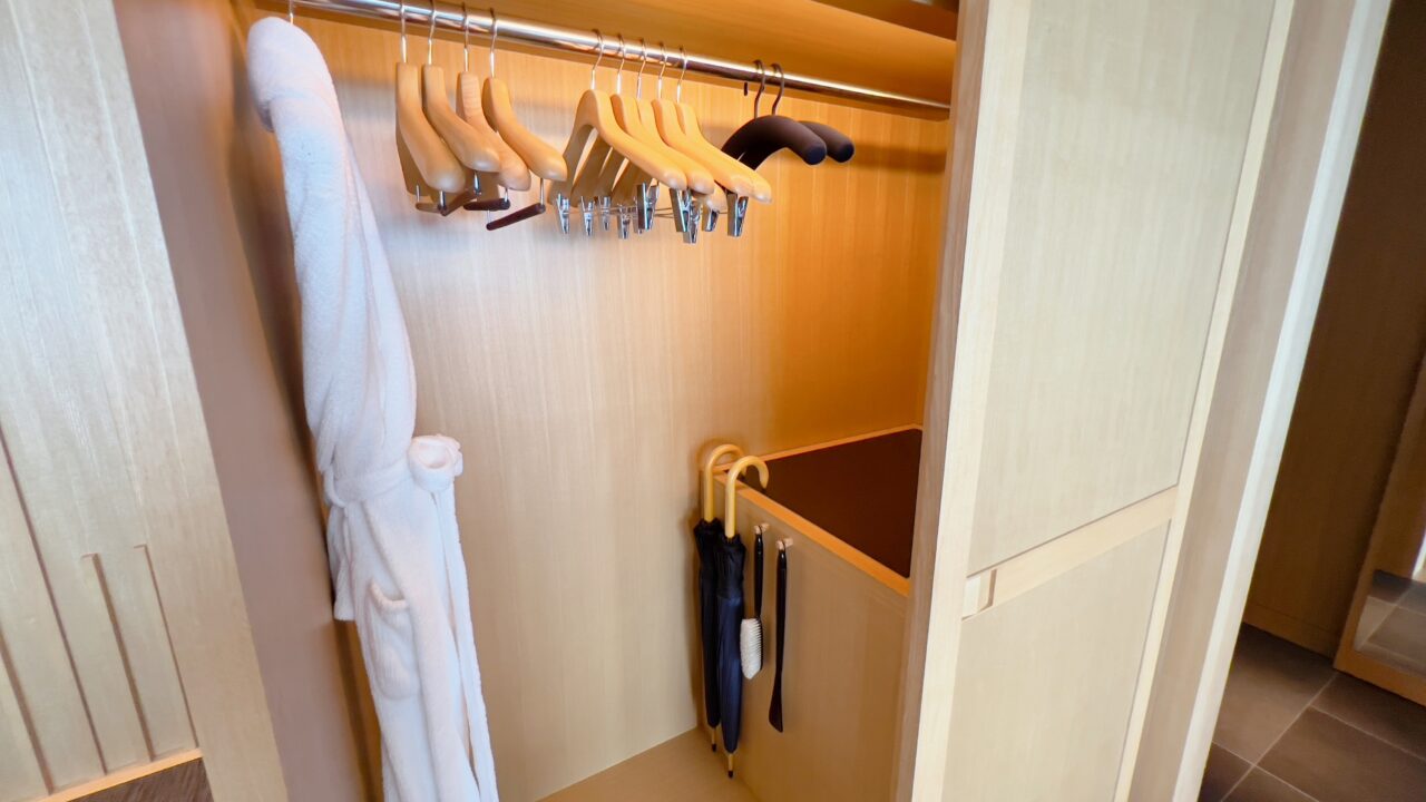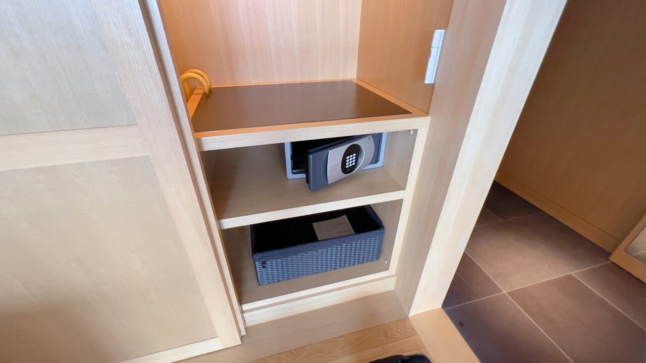 スーツケース置き場の下には引き出しがあり浴衣が入っていました 左右はクローゼットです 傘・ランドリー籠・シューズ籠・金庫・バスローブなどが収納されていました