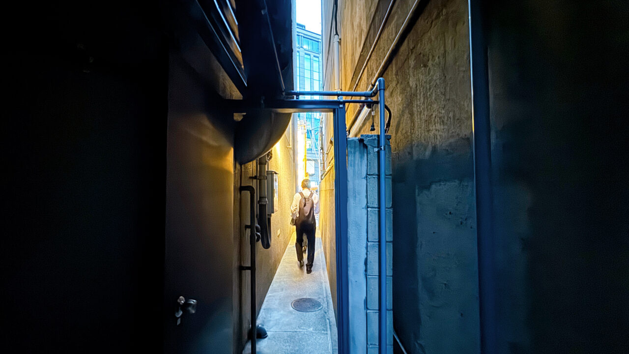 誘導に従い階段を降りていくと、出口は建物と建物の間にある通路に繋がっていました。