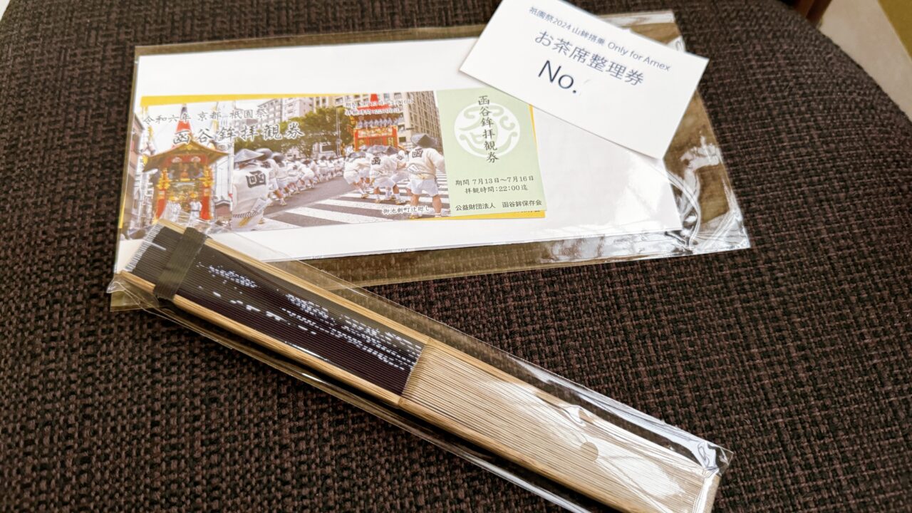お茶席整理券、鉾拝観券、粽引換券、そしてアメックスの扇子です。 ※扇子の詳細は後述します。